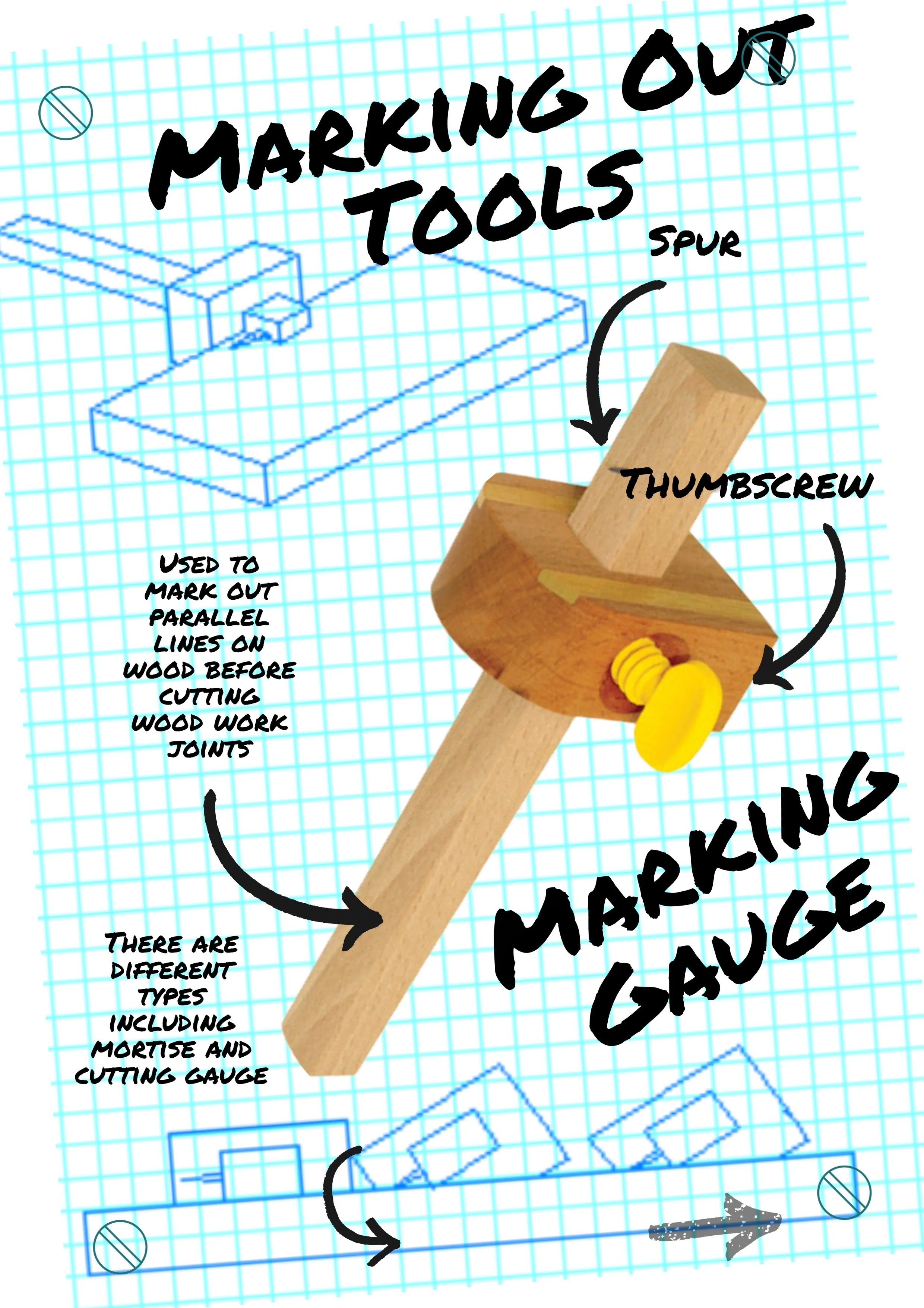 A range of displays highlighting common marking out tools and their function.